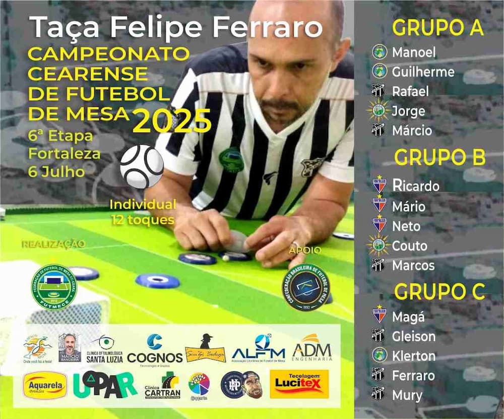 Foi realizada em 6 de julho, no Shopping RioMar Kennedy, em Fortaleza, a VI Etapa do Campeonato Cearense de futebol de mesa 2025, regra 12 toques, com a participação de 15 atletas de 4 clubes: Ceará, Fortaleza, Quixadá e Terra da Luz.